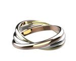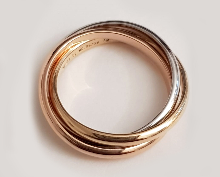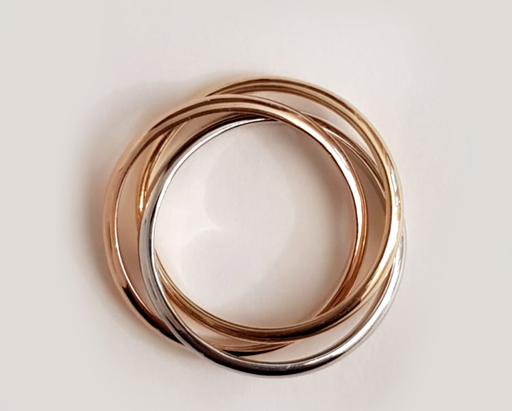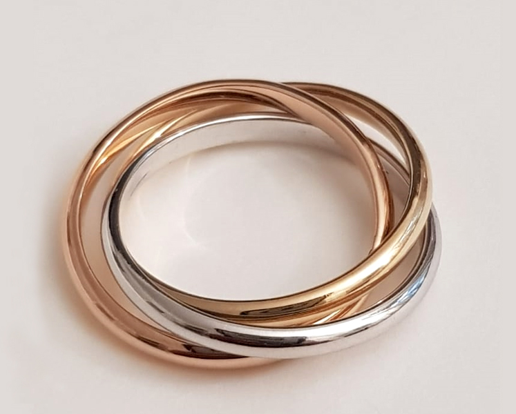 Alliance de mariage “trinity” 3 ors. Originalité d’un bijou constitué de 3 anneaux demi-jonc intérieur plat largeur 1.5 mm ou 2 mm en or rose (5N), or blanc palladié et or jaune
