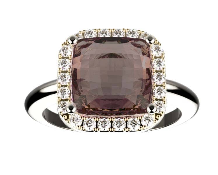 Bague sertie d’une pierre de forme coussin facetté fantaisie entouré d’un halo de 22 diamants Blanc Extra +. Un bijou éthique qui ajoutera une touche d’originalité précieuse à votre look.