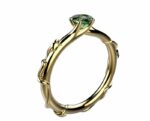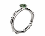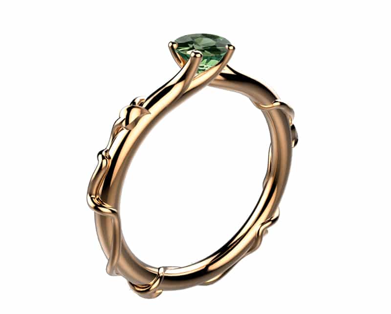 – Une bague saphir vert, un modèle unique avec son anneau comme ciselé, directement insipiré par la nature