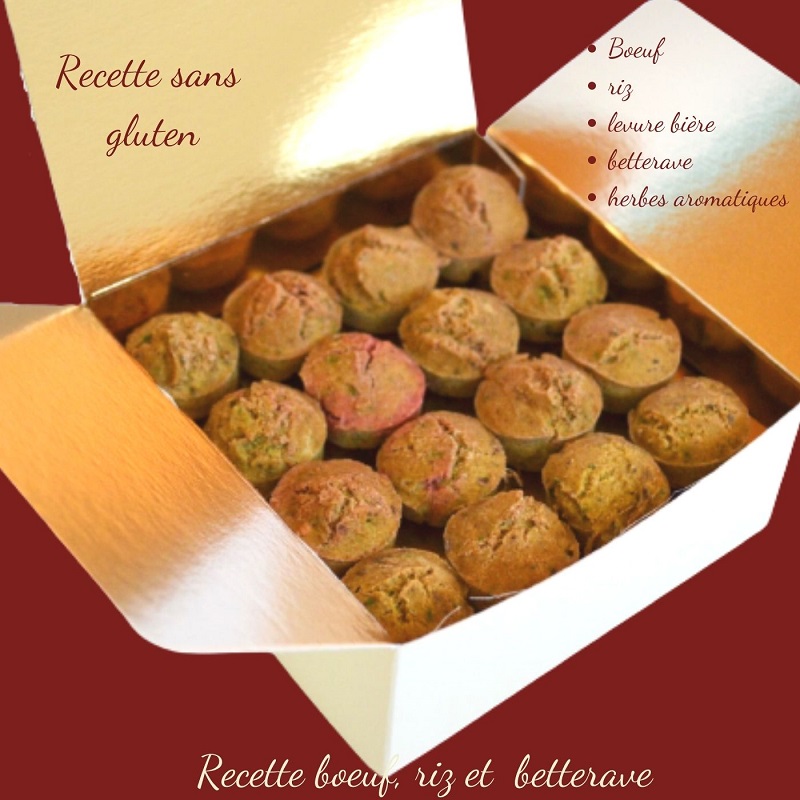 Boite de gourmandises pour chiens , recette artisanale au boeuf , à déguster en récompense ou à offrir en cadeau .