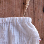 Ce bloomer bébé double gaze de coton bio GOTS est confectionnée dans une double gaze de coton plumetis, de couleur lait. Des élastiques aux cuisses et à la ceinture pour plus de praticité et de confort.