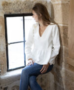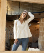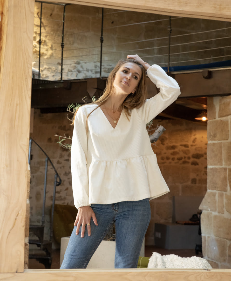 La blouse Lou, dans une nouvelle version en velours côtelé. Un beau tissu écru, épais et doux (210 g/m2).