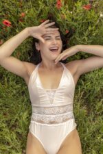 Le Body Magnolia est une pièce d’exception idéale pour mettre votre silhouette en valeur avec un sentiment de liberté et de confort.. Son dos nu, son décolleté plongeant et sa forme tanga révèleront votre sensualité avec élégance grâce au choix des matières : une délicate dentelle blanche au motif de roses associée à un jersey rose poudré subtilement pailleté or. Il s’adapte à toutes les morphologies, épouse vos formes et les sublime. Si vous hesitez entre deux tailles, je vous conseille de prendre la plus grande des deux.