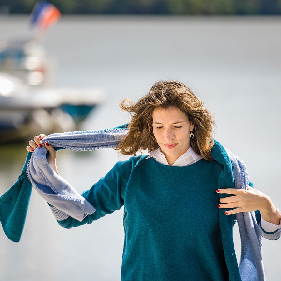 Pour l’écharpe, c’est avec frange mais sur les côtés pour un look différent et un effet enveloppant bien chaud autour du cou.