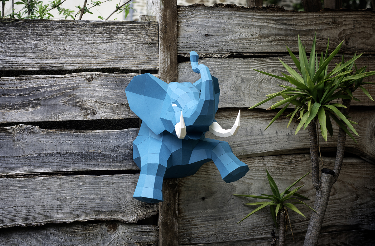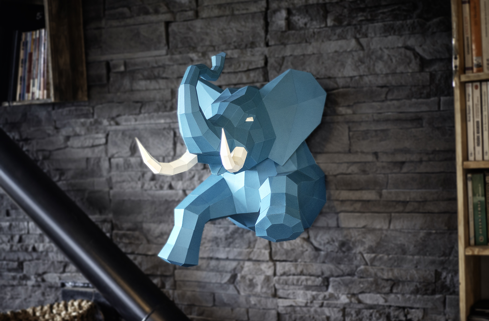 Écartez-vous tous du chemin ! Les trophées éléphants en papier viennent s’installer sur votre mur et ils en imposent ! Ces éléphants semblent prêts à bondir de votre mur, ou à moitié coincés dans votre mur, selon le point de vue.