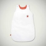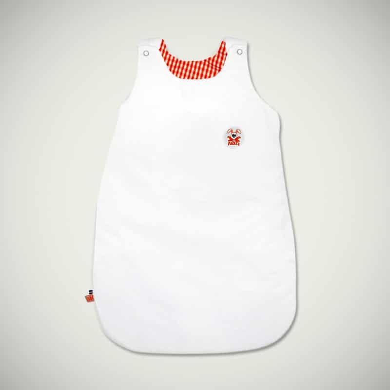 La gigoteuse en coton bio Saxe est toute blanche et doublée d’un tissu vichy orange. Elle est 100% Bio certifiée GOTS, pas de rembourrage ou ouate en polyester.