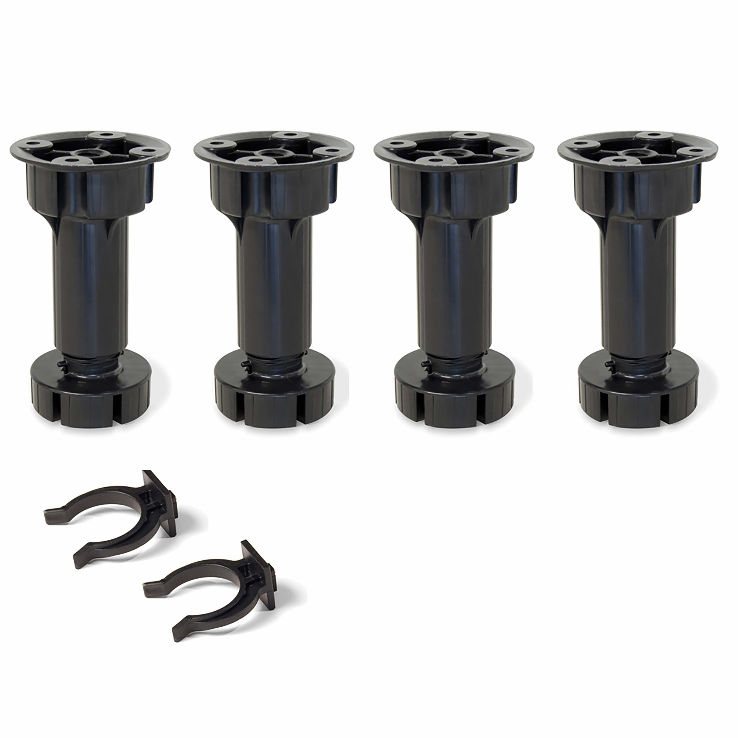 Les pieds réglables pour modules bas de cuisine avec plinthe, élèvent les meubles pour les protéger de l’humidité et faciliter ainsi le nettoyage. Ils sont réglables en hauteur afin de corriger une éventuelle dénivellation du sol. Les pieds réglables offrent une grande capacité de charge, jusqu’à 40 kg sous pression. Ils sont compatibles avec les plinthes en aluminium et en bois pour montage avec vis ou emboîtement.