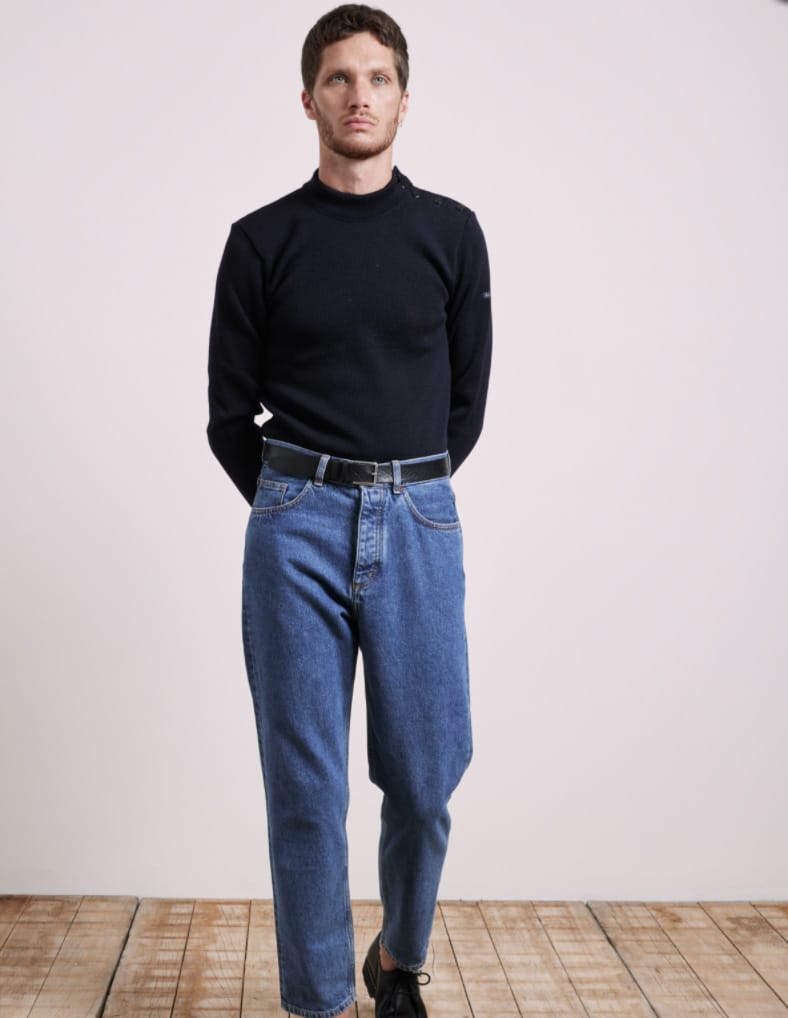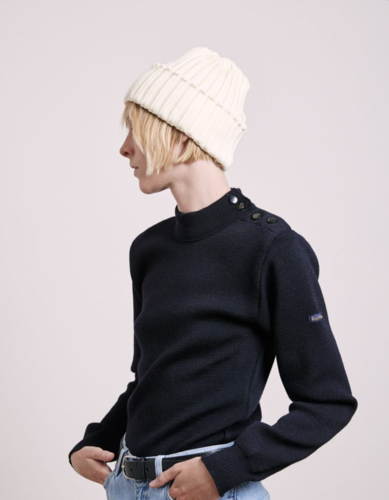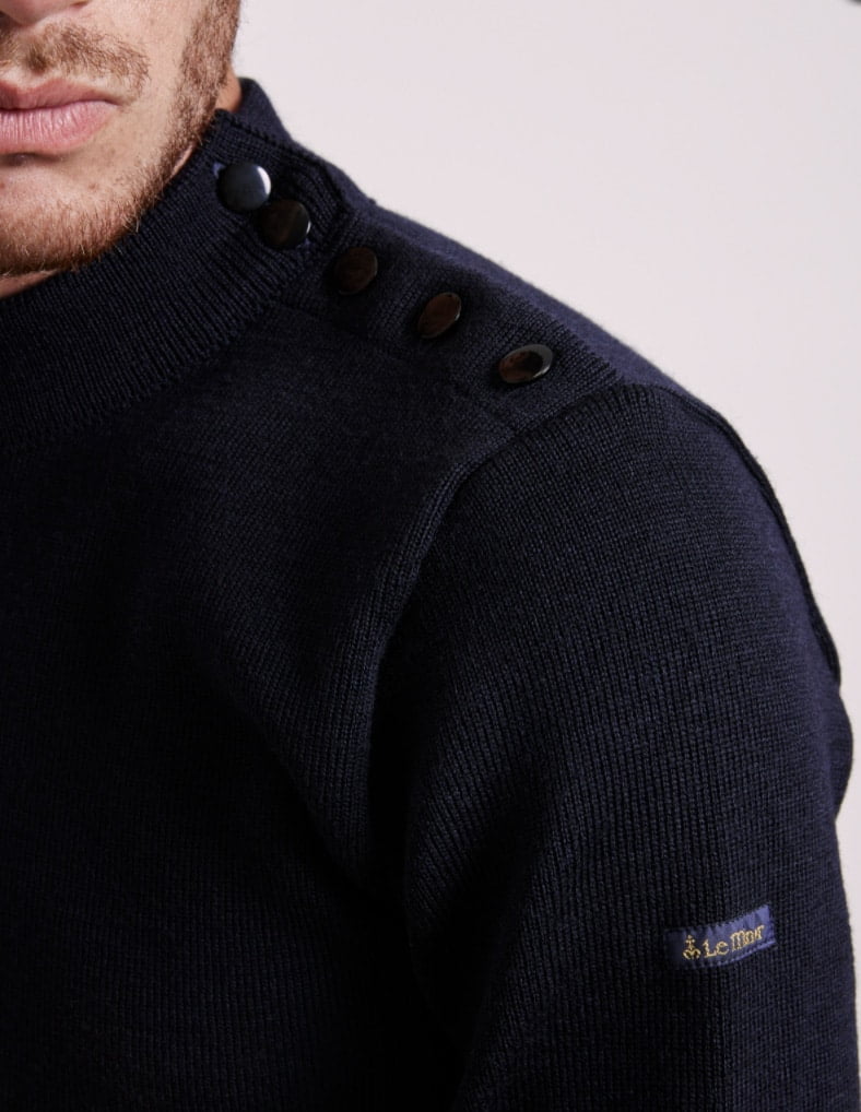Le véritable pull marin pour homme et femme. Ce modèle est indémodable, il arbore aujourd’hui des boutons brillants et se porte près du corps.C’est le premier vêtement fabriqué par la bonneterie Le Minor, destiné à l’origine aux marins pêcheurs bretons.