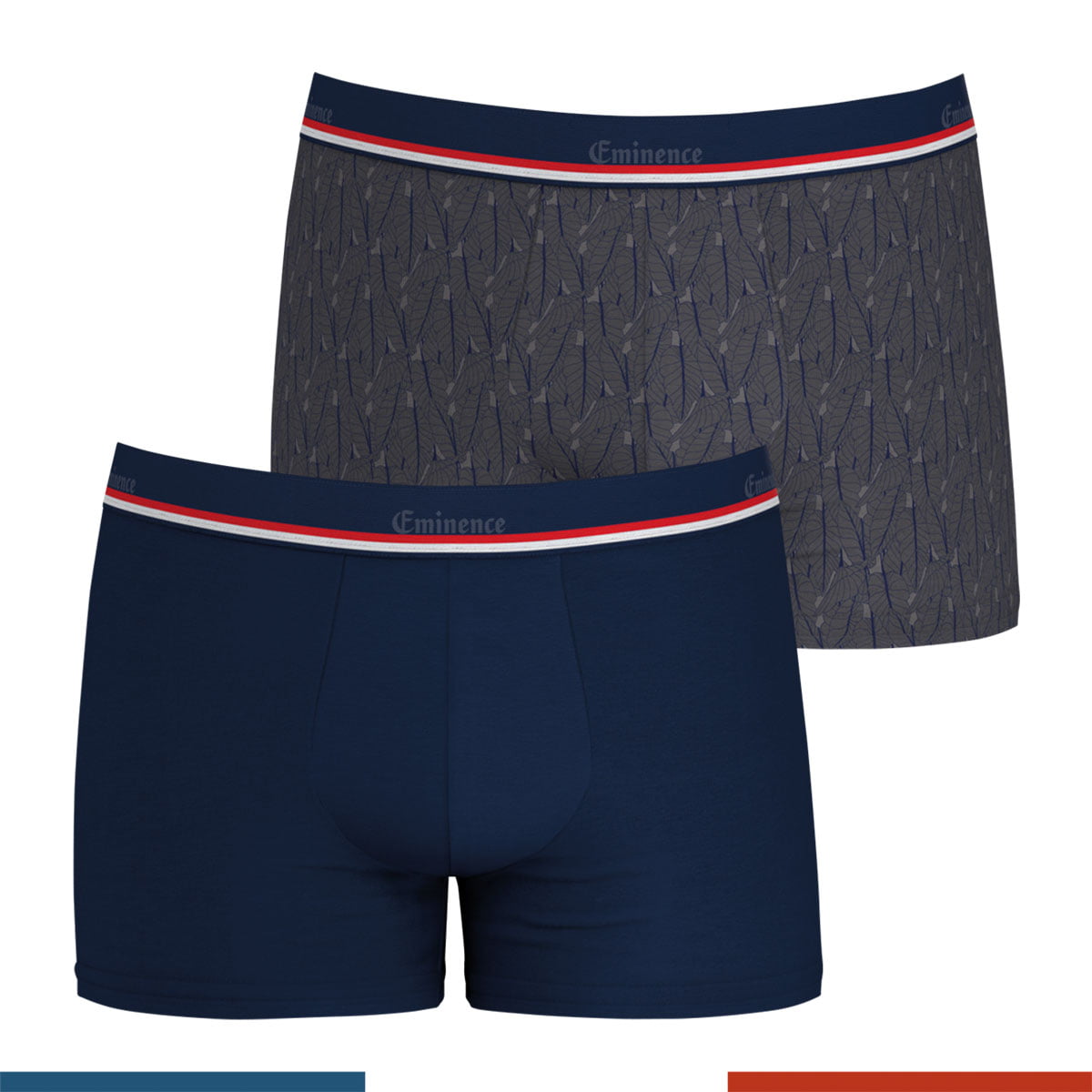 Lot de 2 boxers uni marine et imprimé feuillage kaki Made in France Eminence pour homme Les sous-vêtements de notre collection « FAIT EN France » sont des boxers 100% fabriqués dans nos usines du Sud de la France, perpétuant ainsi le savoir-faire de la marque. Le lot de deux boxers Made in France unis en coton stretch est composé d’un shorty marine et d’un shorty feuillage kaki. Ce modèle s’affiche avec des finitions soignées et raffinées et une ceinture tricolore, qui rendent ce lot de shortys à la fois chic et original. Nos boxers fait en france sont conçus en coton ultra-stretch qui permet une sensation de confort ainsi qu’un incroyable maintien. Ces qualités sont renforcées par la coupe impeccable et étudiée ; en effet, l’avant du boxer est doublé.