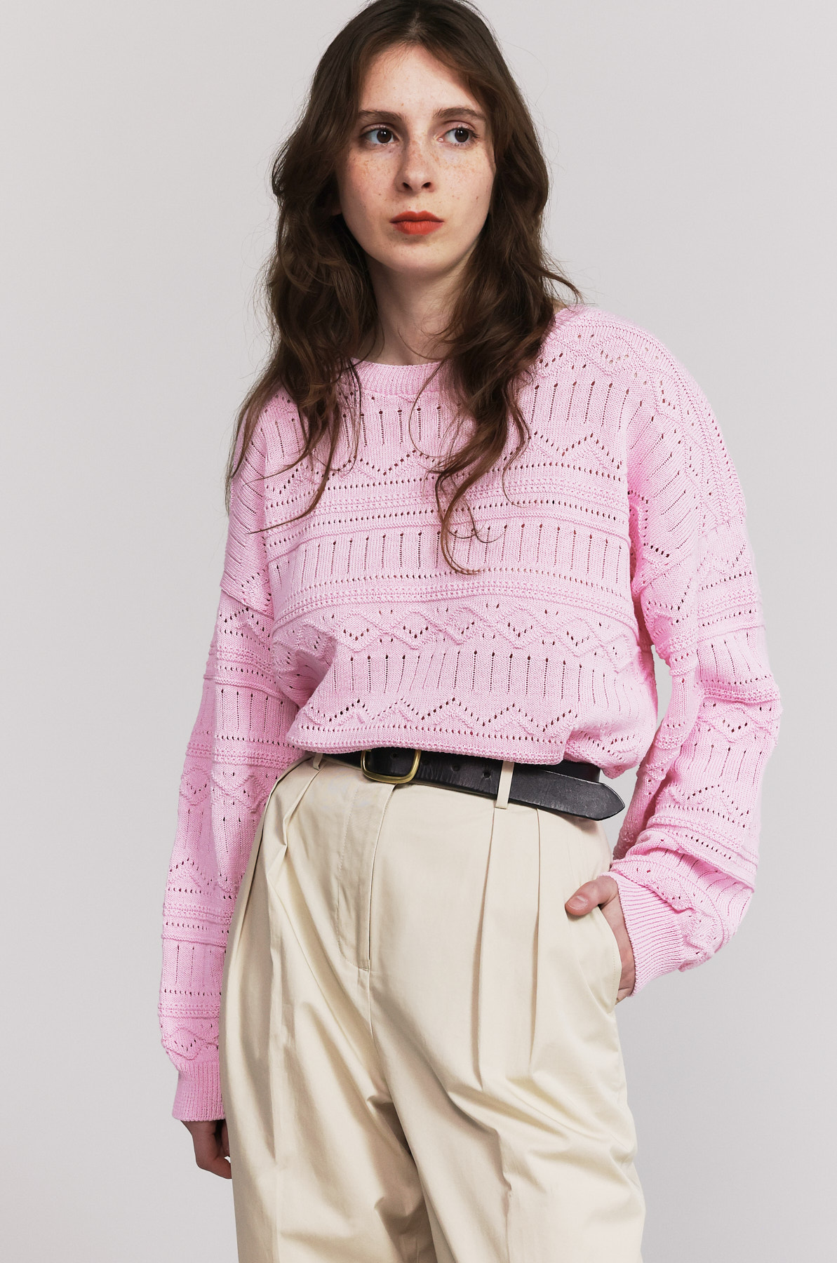 La maille Taline est l’addition parfaite du style et de la technicité. Cette pièce est entièrement ajourée de points de maille différents, ce qui laisse apparaitre notre inspiration graphique sur toute la pièce. Sa forme est ample avec des épaules tombantes. Resserré en bas de pièce et aux poignets afin d’avoir un côté légèrement bouffant et une meilleure tenue de la pièce. Le fil est particulièrement retordu, ce qui donne un effet sec et frais. Notre modèle porte habituellement du S, mais cette fois-ci, nous avons opté pour du M pour obtenir un effet loose.