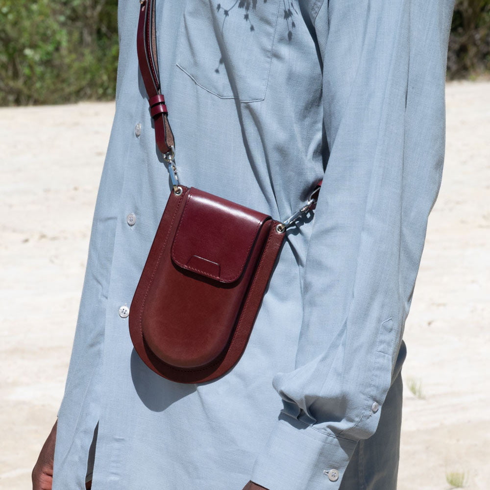 Terme japonais qui désigne un vent qui souffle fort sur la pente d’une montagne, parfois sous forme de fortes rafales à travers la plaine de Kanto du côté de l’océan Pacifique du centre de Honshu. – Pochette téléphone en cuir tanné végétal moulé, doublure en cuir nubuck, fermeture magnétique, poche carte intérieure plaquée, porté épaule. Compartiment principal: 15 x 8,5 x 1,5 cm / Poche intérieure: format CB