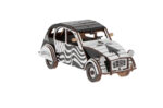 Cette petite 2Cv en bois existe aux couleurs de la Bretagne ou de couleur jaune et noire.