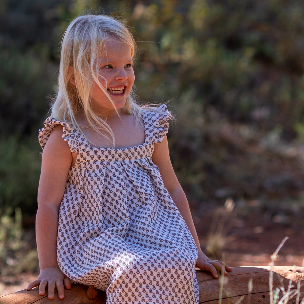 Cette ravissante robe fleurie à volants est confectionnée en double gaze de coton biologique imprimé fleuri. Les bretelles sont joliment boutonnées avec des boutons en bois naturel.
