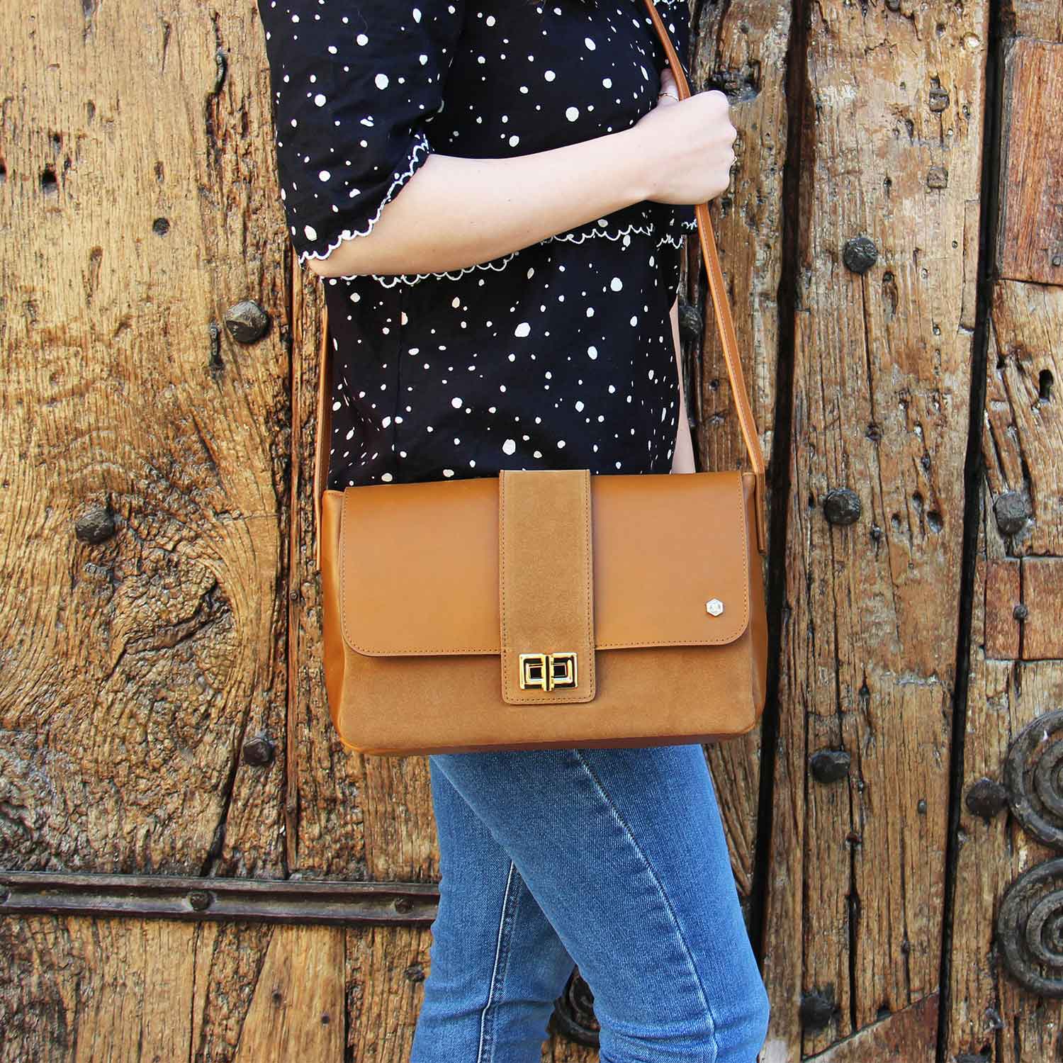 Grand classique de votre vestiaire, le sac bandoulière bi-matière : cuir lisse et cuir velours camel, orné de décorations dorées. Muni d’une doublure en toile de coton et d’une poche zippée.