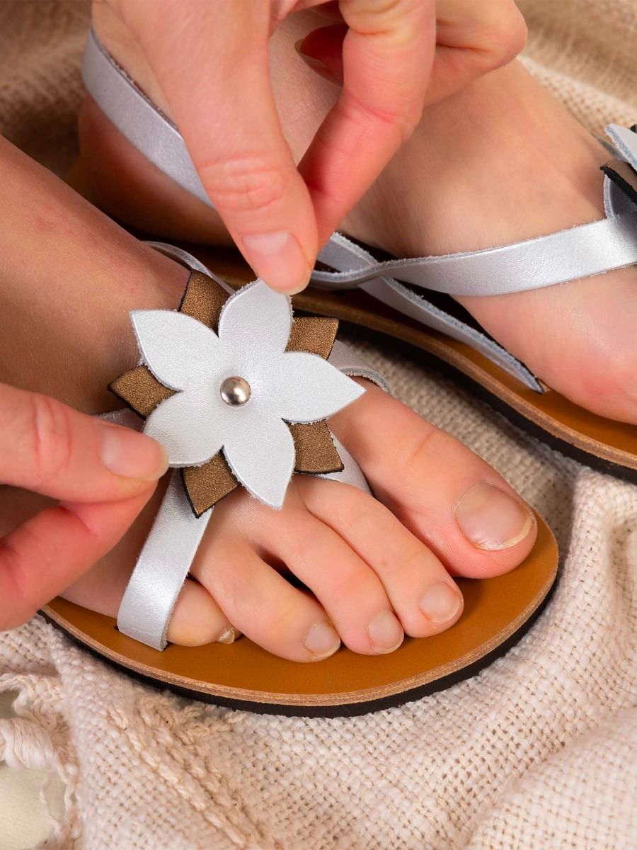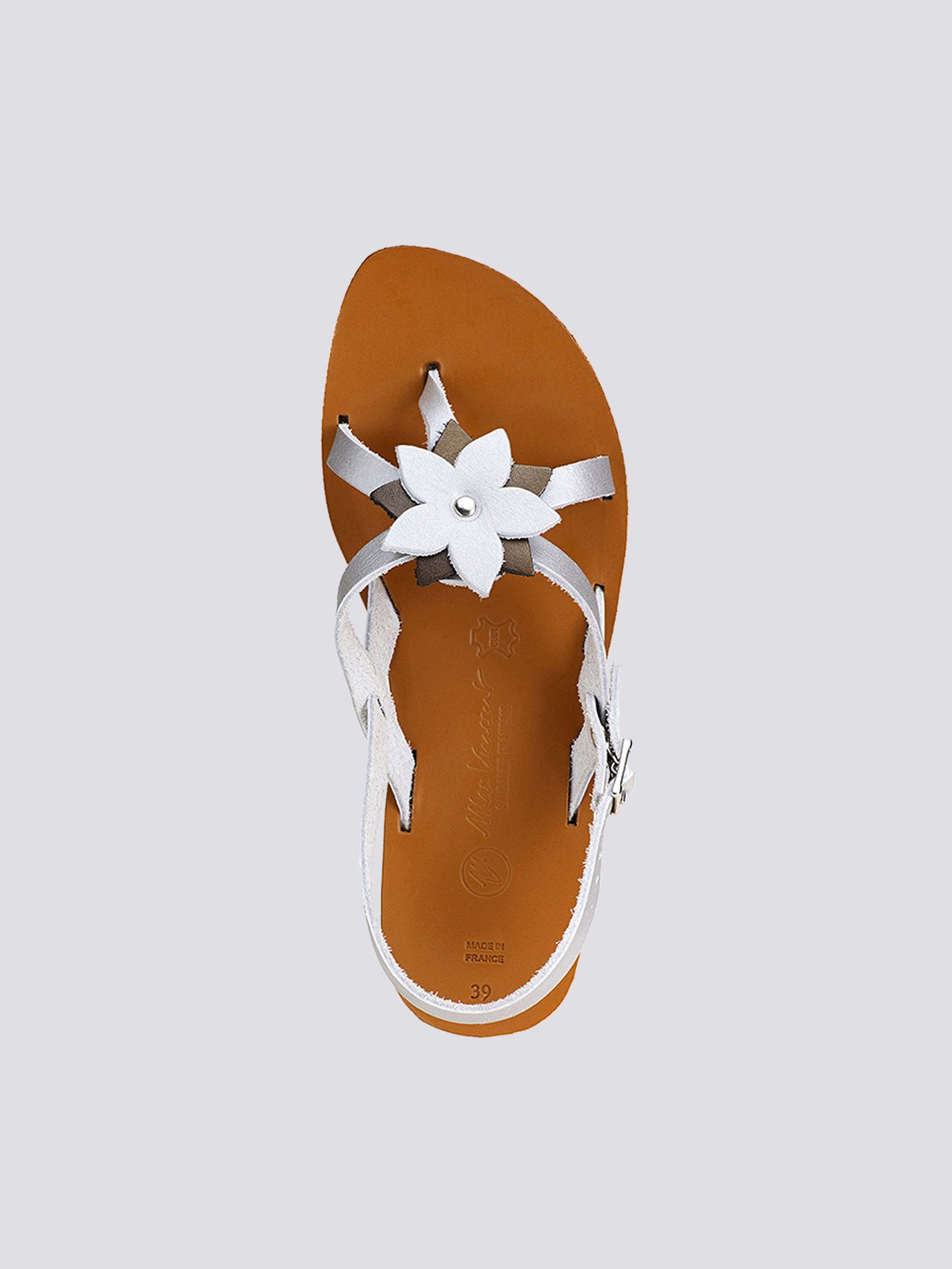Voici la sandale fantaisie avec fleur en cuir CEYLAN Bicolore. Avec sa couleur Argent et sa fleur Mordoré, elle apportera de l’originalité à votre tenue.