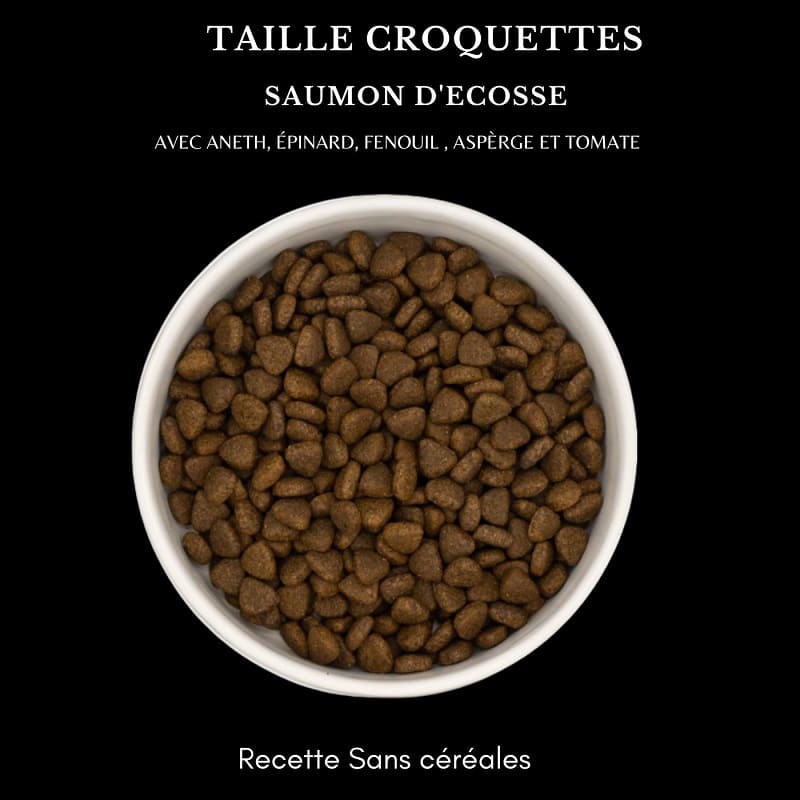 Croquettes pour petit chien adulte au Saumon d’Ecosse avec aneth, épinard, fenouil, asperge et tomate . 65 % de Saumon au total, Minimum 35 % de saumon écossais fraîchement préparé, Collagène d’origine