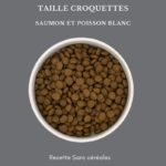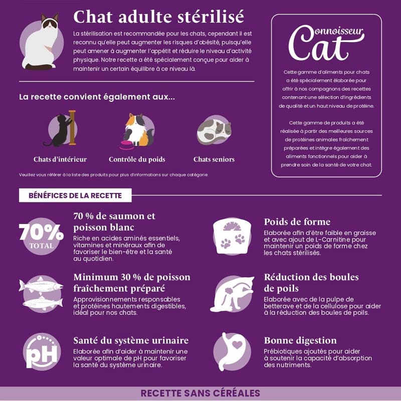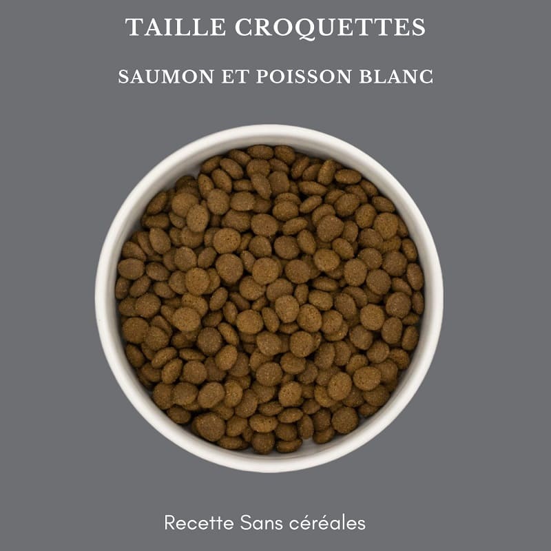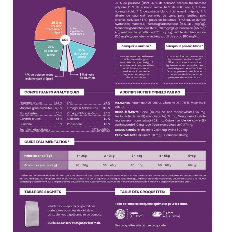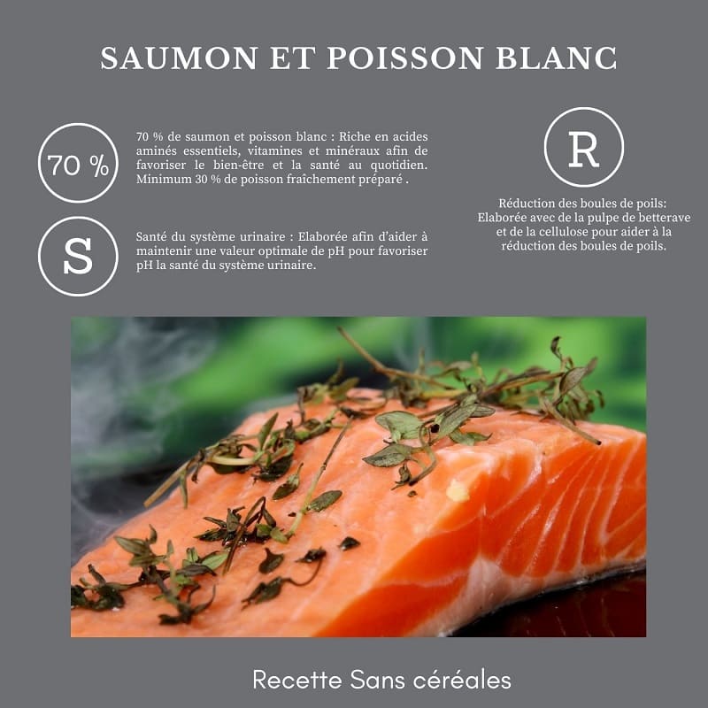 Croquettes haut de gamme pour chat adulte stérilisé au saumon avec 70 % de saumon et poisson blanc .