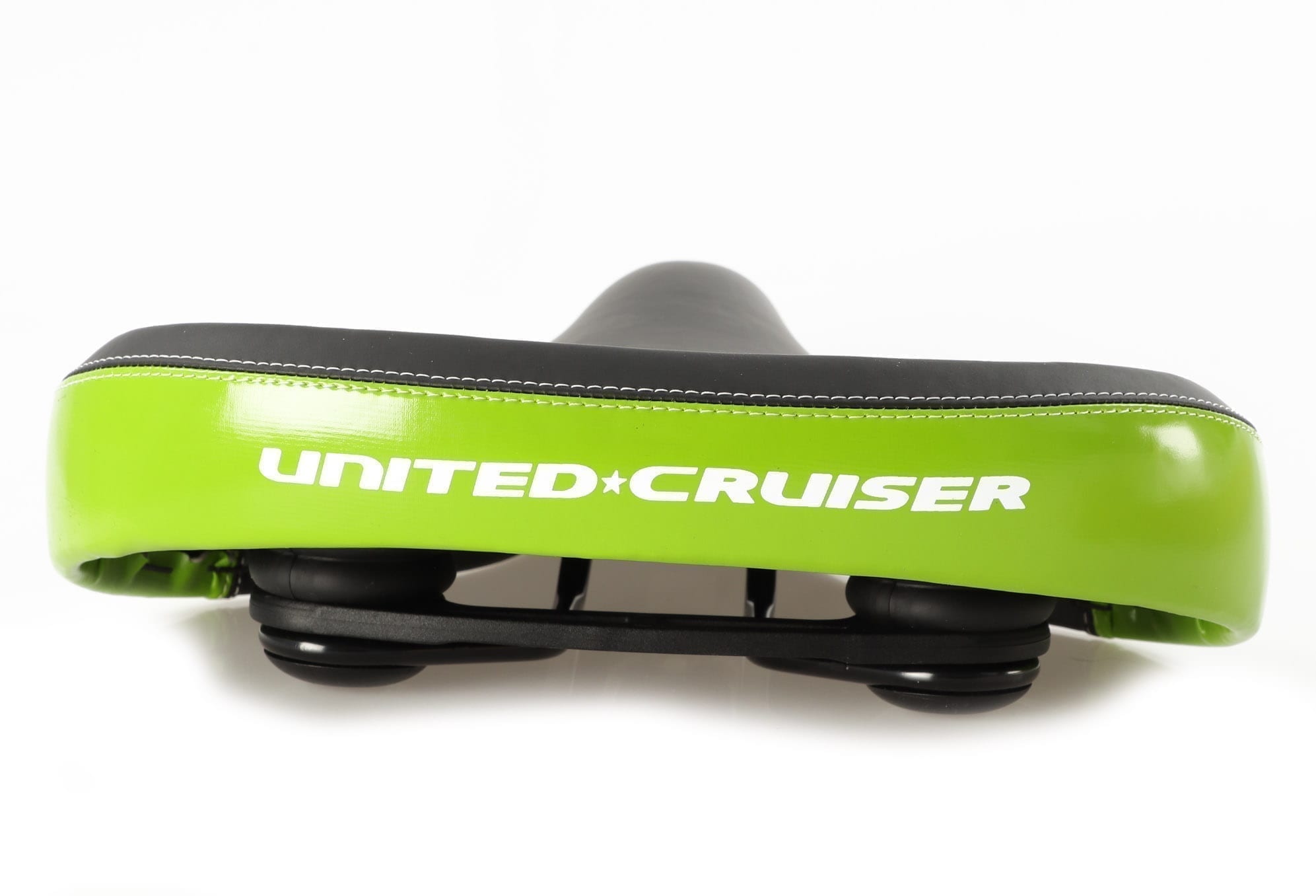 Selle TWO TONE / Elastomer / logo peint en blanc/ GREEN et BLACK Selle taille XL bi-ton ou two tone noir et dos bleu de Beach Cruise. Une assise large ultra confortable. Son amortissement se fait à l’aide de tampons elastomers et son ergonomie caractéristique lui confère un confort inimitable. Le revètement en simili-cuir bicolore offre un très joli design et permet un entretien facile. Une des meilleures selles pour qui cherche le compromis parfait entre le look, le confort et l’agrément. Le logo de la marque United Cruiser est peint en blanc.