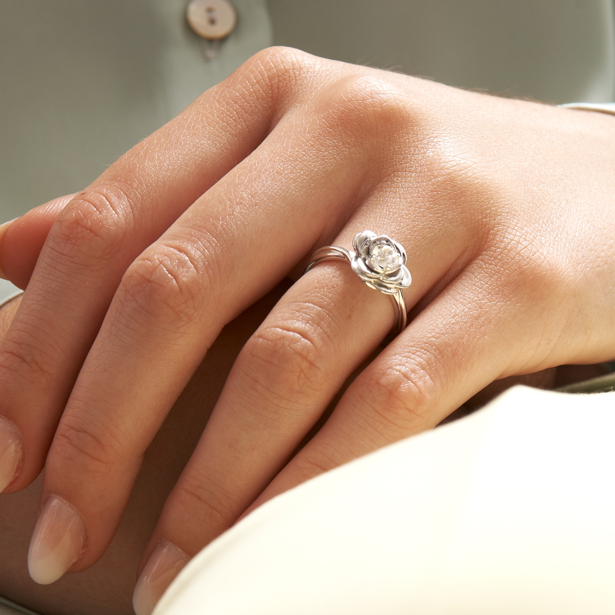 Un solitaire diamant en or blanc palladié qui dessine sur votre main les délicats pétales du camélia. D’inspiration florale, un design tout en tendresse et douceur sur un thème cher à la joaillerie, notre Sophie abrite en son coeur un diamant haut de gamme qui lui apporte tout son éclat. Existe également en or jaune et or rose.