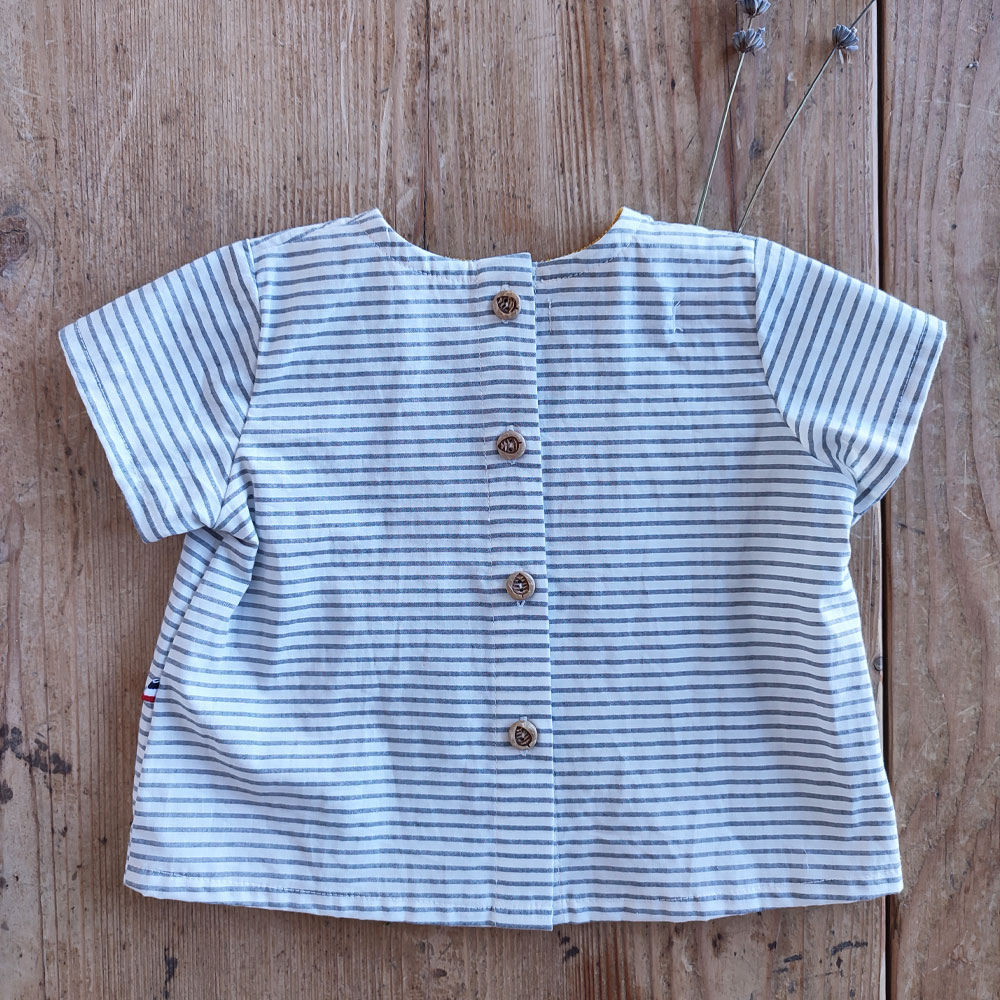 Ce top bébé marin en coton bio GOTS est confectionné dans un tissu à rayures marin grises. De jolis boutons en noix de coco gravés, ferment entièrement le dos de ce t-shirt.