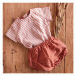 Ce top léger et confortable est disponible pour vos bébés et enfants âgés de 6 mois à 8 ans. Vous pouvez créer des ensembles assortis pour vos enfants en associant ce top avec le cardigan SARIETTE doublé de coton rayé ou la barboteuse JASMIN en coton à rayures sienne et blanc.