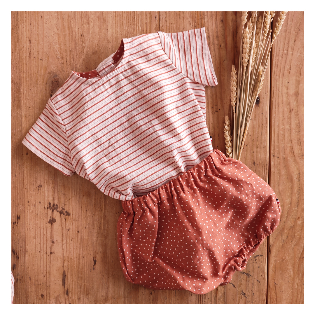 Top enfant rayé et mixte, à manches courtes, dans un joli coton tissé à rayures sienne et blanches. Un motif rayures intemporel aux couleurs des ocres cette saison !