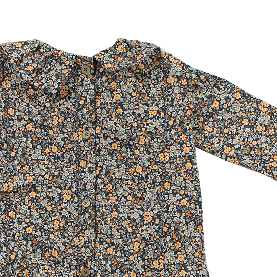 Ce top enfant en coton bio GOTS pour bébé est confectionné dans un tissu imprimé fleuri, dans des tons de marine et orange. De jolis petits boutons en véritable noix de coco viennent fermer le dos.